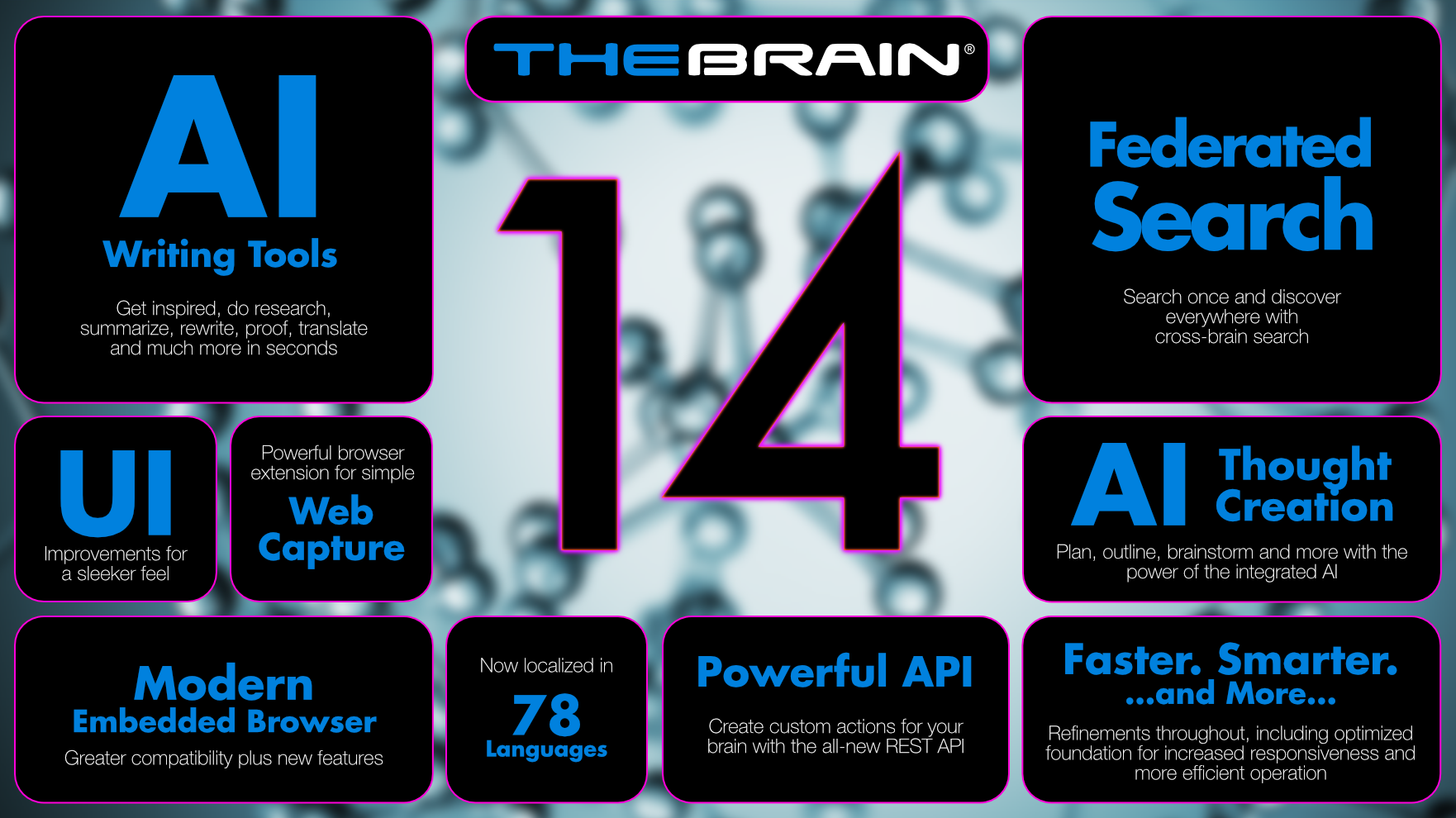 TheBrain 14 revolutionizes your digital thinking canvas with AI-driven thought generation and writing tools, cutting-edge search capabilities spanning across multiple brains, an enhanced web-browsing experience for Windows users, sleeker UI, and a multicultural interface that speaks in 78 languages. Think deeper and achieve those eureka moments effortlessly with TheBrain 14.